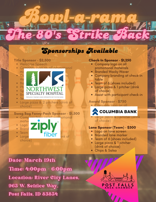 Grab your team & 80's gear and join us for a fun day of bowling at the Post Falls Chamber's first Bowl-a-Rama-The 80's Strike Back!