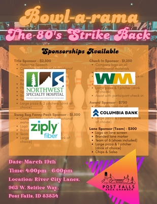 Grab your team & 80's gear and join us for a fun day of bowling at the Post Falls Chamber's first Bowl-a-Rama-The 80's Strike Back!