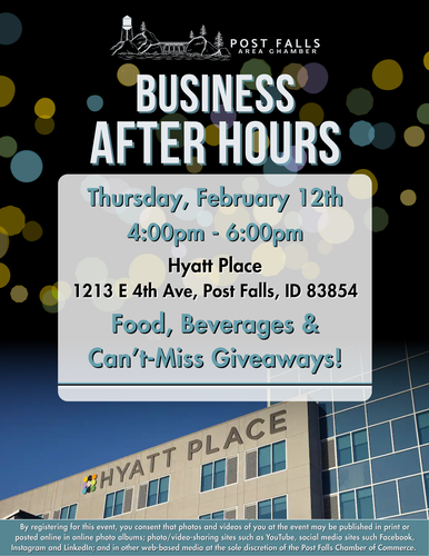 By registering for this event, you consent that photos and videos of you at the event may be published in print or posted online in online photo albums; photo/video-sharing sites such as YouTube, social media sites such Facebook, Instagram and LinkedIn; and in other web-based media at the sole discretion of the Post Falls Chamber of Commerce.