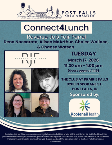 By registering for this event, you consent that photos and videos of you at the event may be published in print or posted online in online photo albums; photo/video-sharing sites such as YouTube, social media sites such Facebook, Instagram and LinkedIn; and in other web-based media at the sole discretion of the Post Falls Chamber of Commerce.