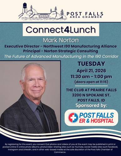 By registering for this event, you consent that photos and videos of you at the event may be published in print or posted online in online photo albums; photo/video-sharing sites such as YouTube, social media sites such Facebook, Instagram and LinkedIn; and in other web-based media at the sole discretion of the Post Falls Chamber of Commerce.