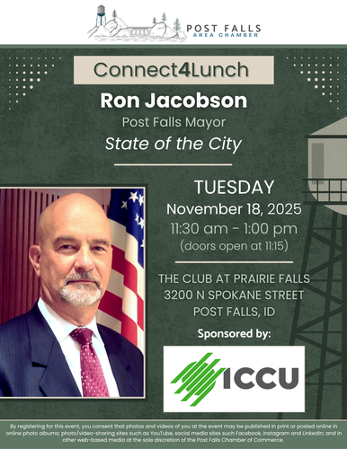 By registering for this event, you consent that photos and videos of you at the event may be published in print or posted online in online photo albums; photo/video-sharing sites such as YouTube, social media sites such Facebook, Instagram and LinkedIn; and in other web-based media at the sole discretion of the Post Falls Chamber of Commerce.