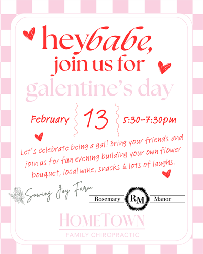 Join us for HomeTown Family Chiropractic's Annual Galentine's Party! Let's celebrate being a woman and our friendships with making your own bouquets from Sowing Joy Farm, wine pouring by Rosemary Manor and light bites!