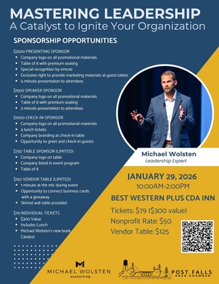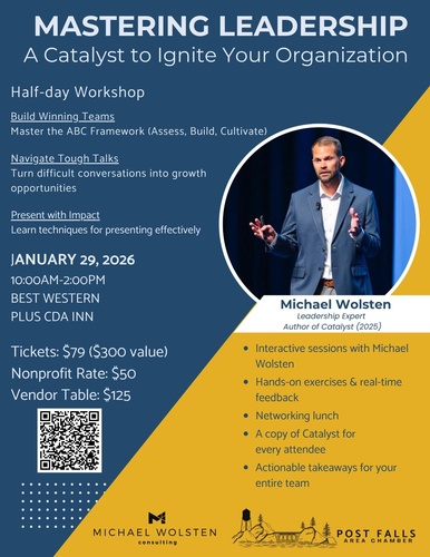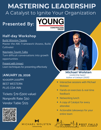By registering for this event, you consent that photos and videos of you at the event may be published in print or posted online in online photo albums; photo/video-sharing sites such as YouTube, social media sites such Facebook, Instagram and LinkedIn; and in other web-based media at the sole discretion of the Post Falls Chamber of Commerce.