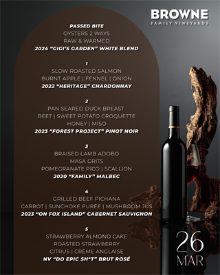 This winemakers' dinner will be our new executive head chef's first wine pairing dinner experience here at Prairie Falls! Chef Will Torres has an extensive culinary history including an incredible honor to host a wine dinner at the James Beard House in New York, so we are beyond thrilled for his debut winemakers' dinner here with us!